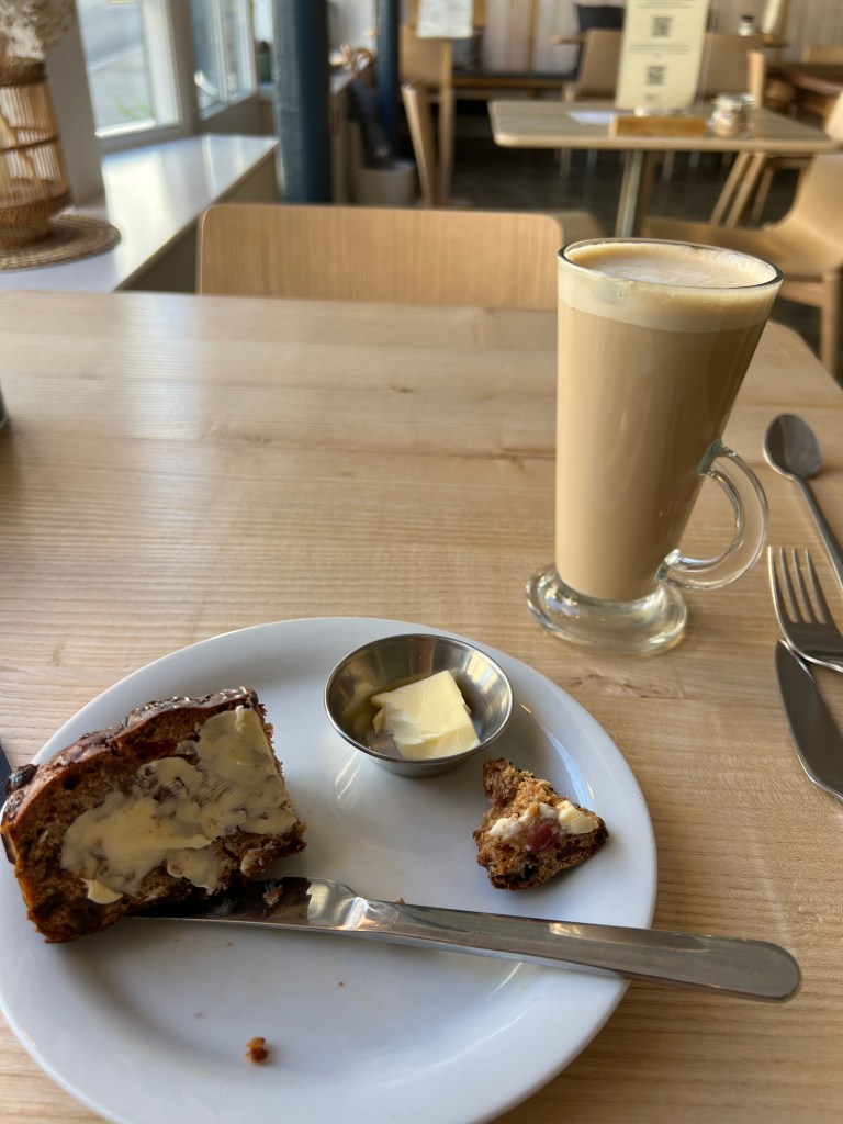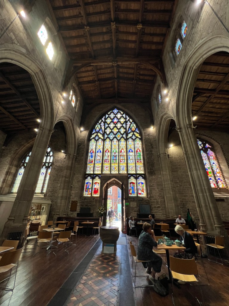 Up bright and early to start packing and tidying for tomorrow’s departure to Knighton. Today was for exploring the Castle, and the church after which my Inn is named. I began with a lovely breakfast (brecwast, in Welsh) at Kin Kitchen. My third trip to Wales and I had never had bannock. It’s a dense, fruity bread and delicious. Rest of breakfast was halloumi, salad, and mushrooms with gravy.