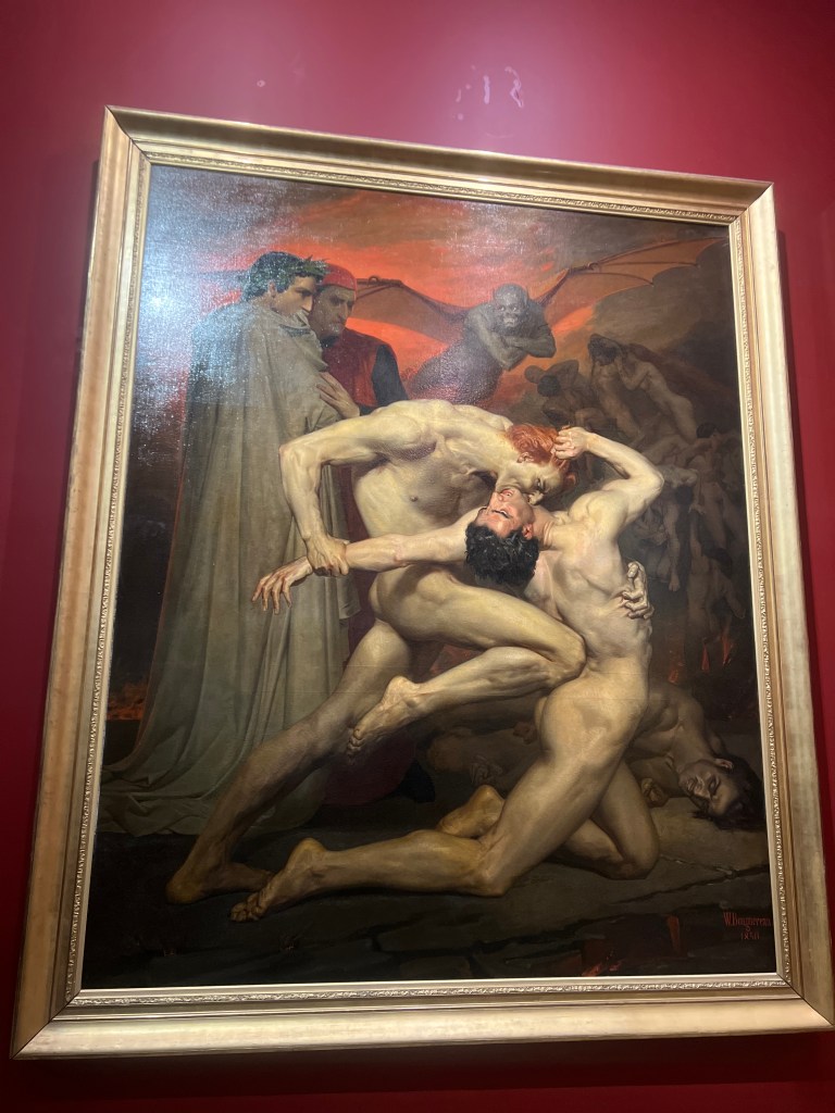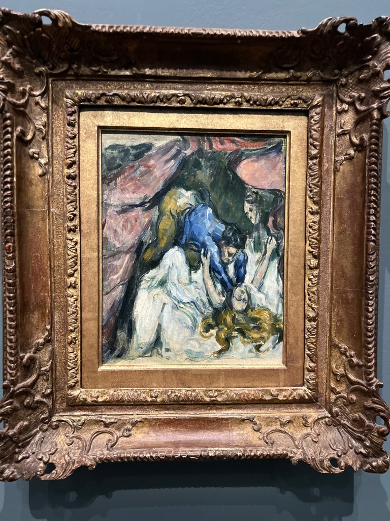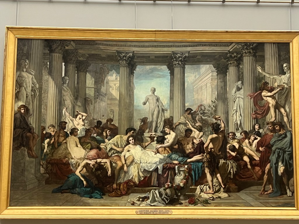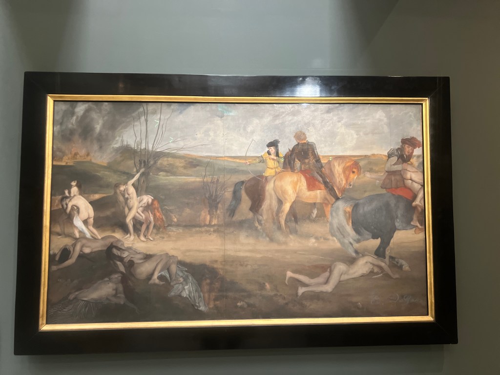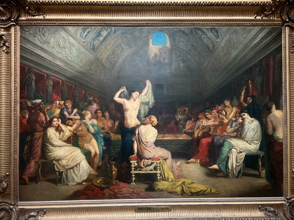 The Bohemians. The individuals in the painting are believed to be Krohg’s friends, students, and fellow artists, including Edvard Munch (seated at the left), Constance Bruun, Oda Krohg (the artist’s wife), and Kalle LøchenOda, Krogh’s wife. They had, by all accounts, a pretty fiery but long-lived marriage. Her spirit is on display here!Man Overboard. Fascinating in it’s action and immediacy.The Morning After, an obvious homage to his student Edvard Munch.No comment needed! Pretty awesome to see this in person!Scene of War in the Middle Ages,” also known as “The Suffering of the City of New Orleans,” by Edgar Degas. The painting uses a medieval setting to symbolize the suffering of the American city of New Orleans, which was occupied by Union troops during the Civil War. A pretty shocking departure from what I’m used to seeing from Degas.Paul Cezanne, The Modern OlympiaAnd Olympia’s cat!The original Olympia, by Manet.Her unflinching gaze.Her maid.And yes. Her cat.Thomas Couture, The Decadence of the Romans. Fabulous detail in this. Some folks are not so happy at all this revelry. Others merely look bored. The beginning of the end.Naked Men With Sharp Things 1Naked Men With Sharp Things 2Chassériau’s Le Tepidarium. Languorous lesbians?Jean-Auguste Ingres, The Source.