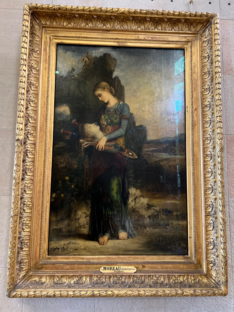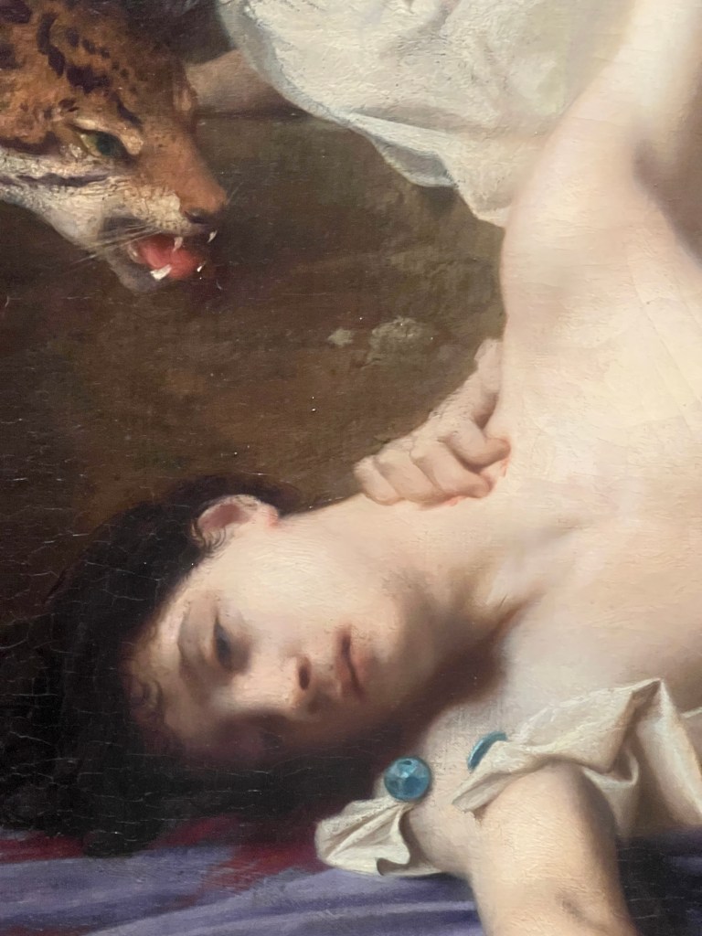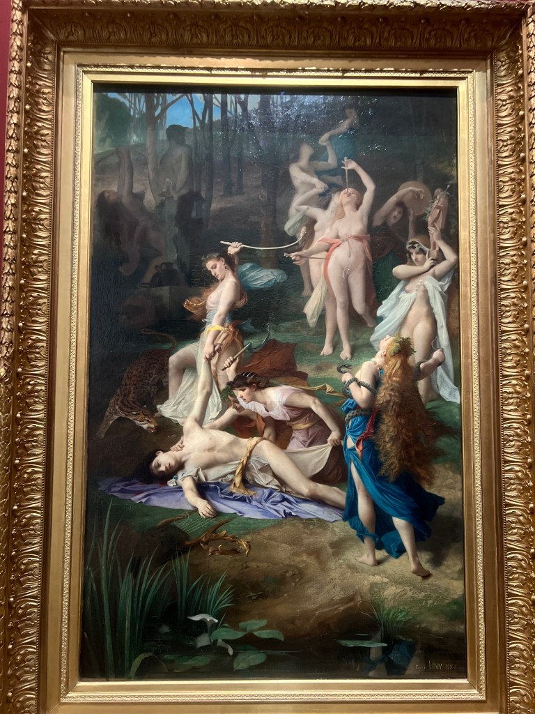 In Greek mythology Orpheus was the son of a Muse, probably Calliope, the patron of epic poetry. He was known as the greatest musician and poet, having no equal. He perfected the lyre after Apollo taught him how to play. There are many stories about Orpheus’ life (one of them I saw a musical of in London, Hadestown!), but this painting focuses on his death. According to Aeschylus, Orpheus only worshipped the god Apollo, which angered Dionysus, who had Maenads rip Orpheus apart in a Dionysian frenzy. Lévy gives us the moment of Orpheus’ death before the horrific dismemberment.