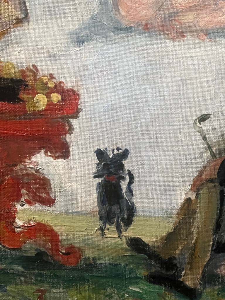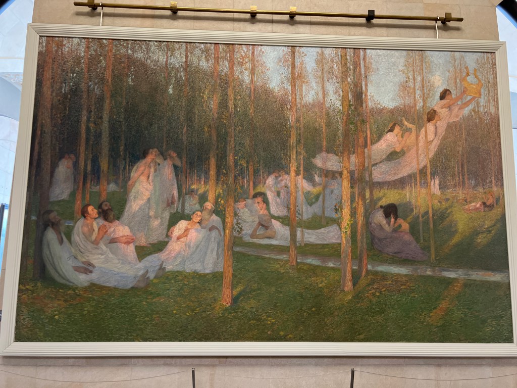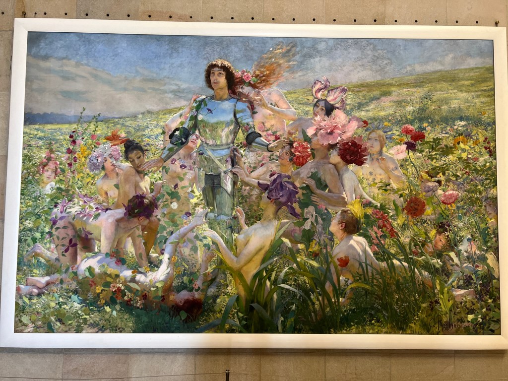 Finding all the kitties. Pierre Bonnard, La Femme au Chat.Kitty!Beautiful. Femmes au Jardin, Pierre Bonnard. I like Pierre, he liked cats!Injalbert, Nymphs & SatyrsI failed to get the artist on this one. Google sez Ravageot and Ravachol by Emmanuel Fremiet.Took this snappy for my husband, who loves trains.The Knight of the Flowers, by Georges Rochegrosse.Gustave Moreau, OrphéeHenri Martin, Sérénité