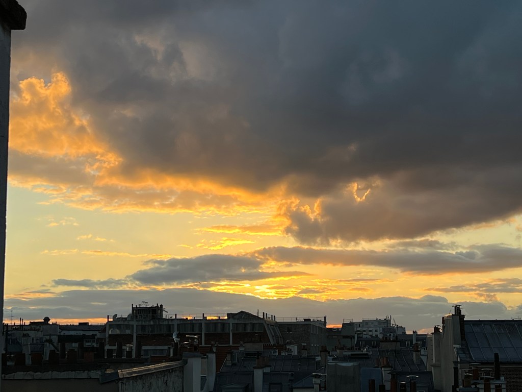My one dinner out, and it was perfections.Shrimp on risotto, with frisé.This is the very essence of Montmartre. Casual elegance and sex toys. Same as it ever was!!Maybe a little spendy, but so so good.Chestnut Paris Brest Cake and vanilla ice cream.Perfect sunset after a perfect Paris day.