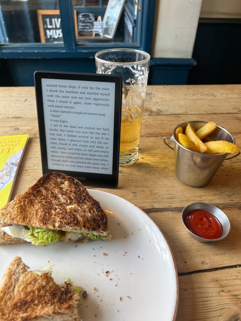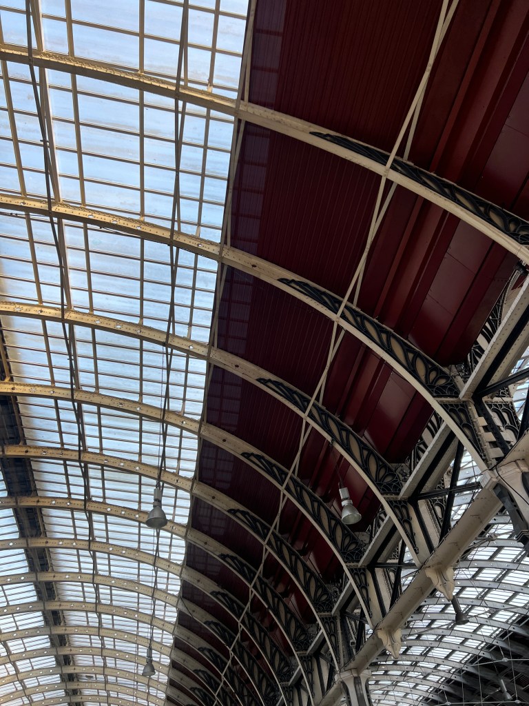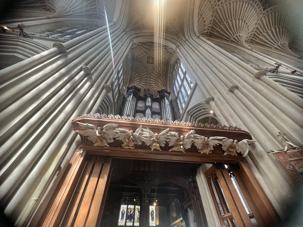 On the way to Bath, zoom!Reflecting pool.Roman baths entry, gorgeous domed ceiling. An owl on a stele.Caldera, where the baths were heated.Three figures.Very old steps stained with minerals.Steps into the main pool.Bit of Celtic writing, one of the only examples in existence.Pediment with sun face.Bath was called Aquae Sulis, and was a sort of resort town.Hairdo of an upper class Roman woman.Dog chases hare This doggo is very happy to see you.Haruspex stone. To be specific, the stone where a haruspex reads the entrails of animals to predict the future. A very acceptable pub lunch, with cider. “Wanted those chips” indeed. (Novel: Percival Everett’s “Dr. No”.)Dogs Always Welcome.Cathedral at Bath.Gorgeous nave, spiney!This cathedral is fire!Carvings around the organ pipes.I may have had impure thoughts about this cellist, rehearsing with vocalists for Bach’s St. John Passion. Mmmhmmm.St. Pancras station’s very pretty Art Nouveau girders. Bonus: an easy destination from my digs! WTF