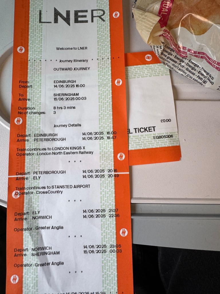 Our plan was to get the bus to the train station on the early side, relax a bit, then be on a mid-afternoon trainride to Sheringham, Norfolk, to spend a couple of days with my friend Christine. Due to some trouble on the line, every train was canceled that would get us to our connection in Edinburgh in time for a train to Sheringham; so we were trying to figure out where to spend the night. Well, there was loads of pearl clutching on my part, David was calm, and it turned out there was a late train to Sheringham we were able to catch out of Norwich. LOL.