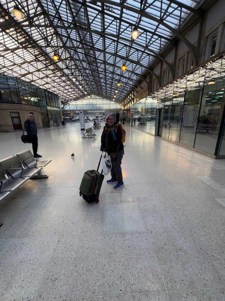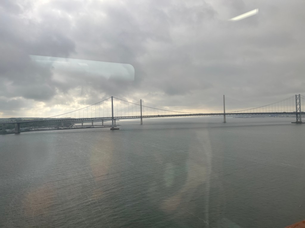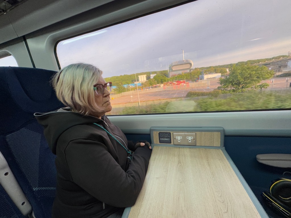 OK so it’s always something. One of the legs of our travel was canceled, so we re-routed. But since we were changing train lines and regions (from Travel Wales to ScotRail), we had to pay again for the last leg from Edinburgh to Aberdeen (because we were supposed to have changed trains in Glasgow, but the cancelation made that impossible). We could’ve filed a claim, but it’s hardly worth it. I must say, the ScotRail conductor was singularly unsympathetic. He could’ve just let it slide. Maybe that’s why I look grumpy, below.